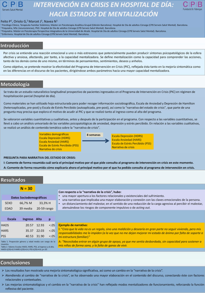 Pablo Feito, psicòleg clínic a l’Hospital de Dia Còrsega, ha presentat el pòster “Intervención en Crisis en Hospitales de Día: Hacia estados de Mentalización” demostrant l’efectivitat del Programa d’Intervenció en Crisi (PIC) tant en la millorar de la simptomatologia psicopatològica de l’esfera afectiva i ansiosa com en les diferències en l’elaboració del discurs/narrativa de la crisi de les persones ateses, reflectint, en ambdós paràmetres, una major capacitat mentalitzadora i un reforç de la funció reflexiva de cada pacient.