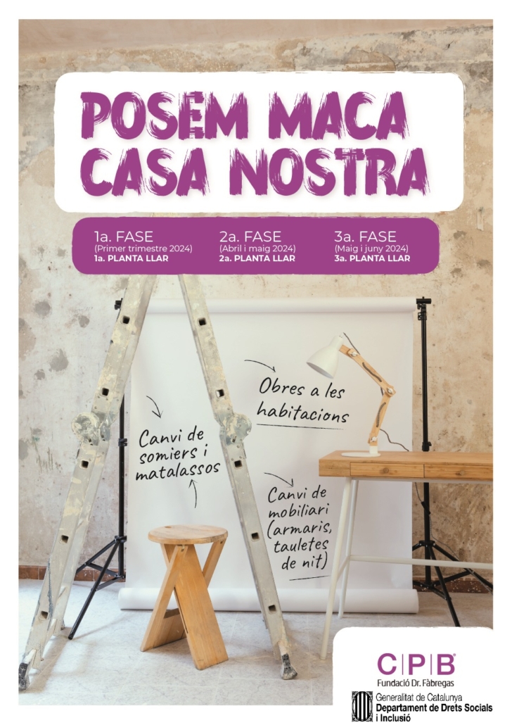 Amb el suport del Departament de Drets Socials i Inclusió, mitjançant Subvenció a projectes d’inversió de construcció, remodelació o equipaments de serveis socials, podem fer realitat les fases de renovació i el lema escollit per la Llar-R Llúria ‘Posem maca casa nostra!’